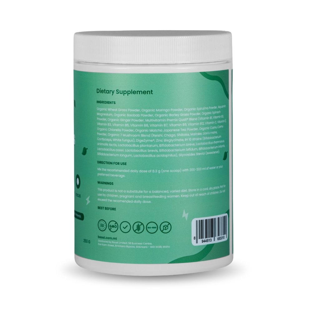 Organic Wheat Grass Powder, Organic Moringa Powder, Organic Spirulina Powder, Aquamin Magnesium, Organic Baobab Powder, Organic Barley Grass Powder, Organic Spinach Powder, Organic Ginger Powder, Multivitamin Premix Quali® Blend (Vitamin B1, Vitamin B2, Vitamin B3, Vitamin B5, Vitamin B6, Vitamin B7, Vitamin B9, Vitamin B12, Vitamin C, Vitamin E), Organic Chlorella Powder, Organic Matcha Japanese Tea Powder, Organic Camu Camu Powder 5%, Organic 7 Mushroom Blend (Reishi, Chaga, Shiitake, Maitake, Lion’s mane, Cordyceps, White fungus), DigeZyme®, Zinc Bisglycinate, IH 10 strains (Bifidobacterium animalis lactis, Lactobacillus plantarum, Bifidobacterium breve, Lactobacillus rhamnosus, Lactobacillus casei, Lactobacillus brevis, Bifidobacterium bifidum, Bifidobacterium infantis, Bifidobacterium longum, Lactobacillus acidophilus), Glycosides Steviol.