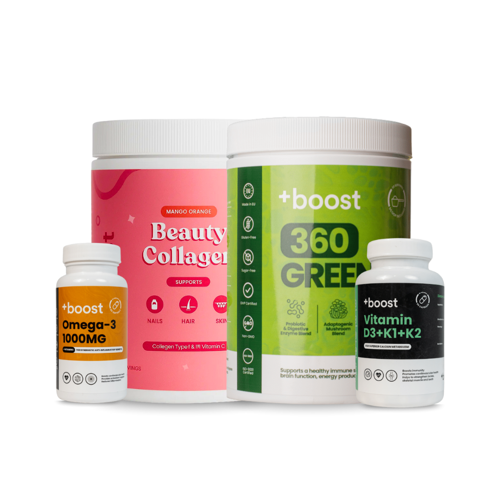 Create your glow-juice in one go: mix Beauty Collagen with water, add a scoop of 360 Greens, stir, then follow with omega-3 and Vitamin D supplements. Enjoy this beautifying ritual daily!
