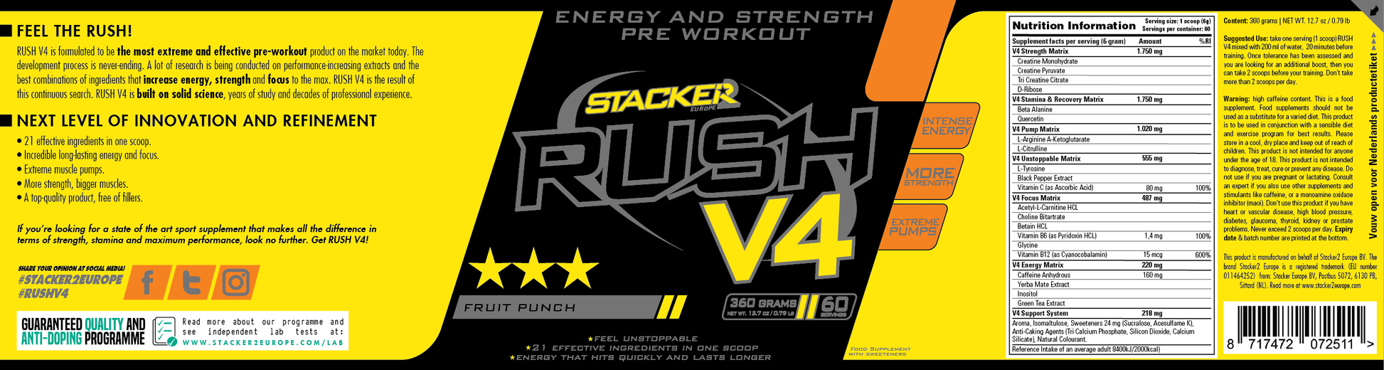 RUSH V4 is engineered to be the most extreme and effective pre-workout supplement on the market today. Developed through relentless research and backed by solid science, years of study, and decades of professional experience, RUSH V4 is the complete reformulation of the successful RUSH Enraged formula — delivering peak performance like never before.
