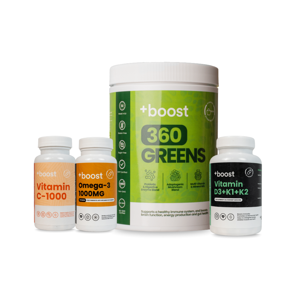 Strengthen digestion and immunity daily with 360 Greens, essential vitamins, and omega-3 support.