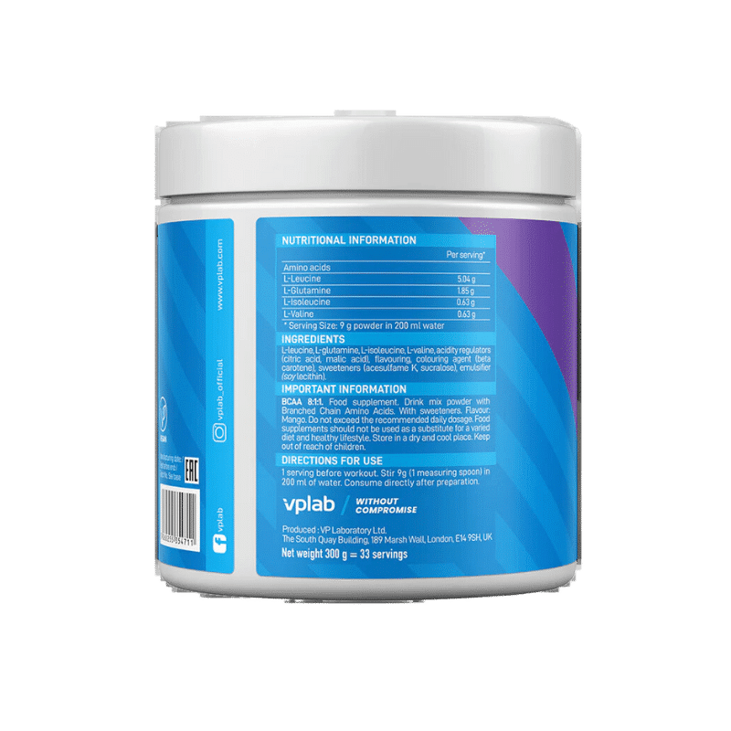 Ingredients: L-leucine, L-glutamine, L-isoleucine, L-valine, acidity regulators (citric acid, malic acid), flavouring, colouring agent (beta carotene), sweeteners (acesulfame K, sucralose), emulsifier (soy lecithin)