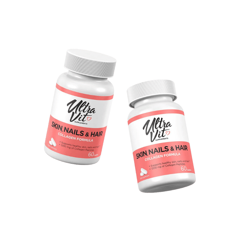 Support your natural beauty from within with UltraVit Skin Nails & Hair, a unique dual-action formula designed to promote healthy skin, nails, and hair. Each easy-to-swallow caplet delivers 1200 mg of high-quality collagen peptides combined with essential vitamins and minerals that stimulate your body’s own collagen production, helping you achieve improved skin elasticity, reduced wrinkle depth, and stronger nails.